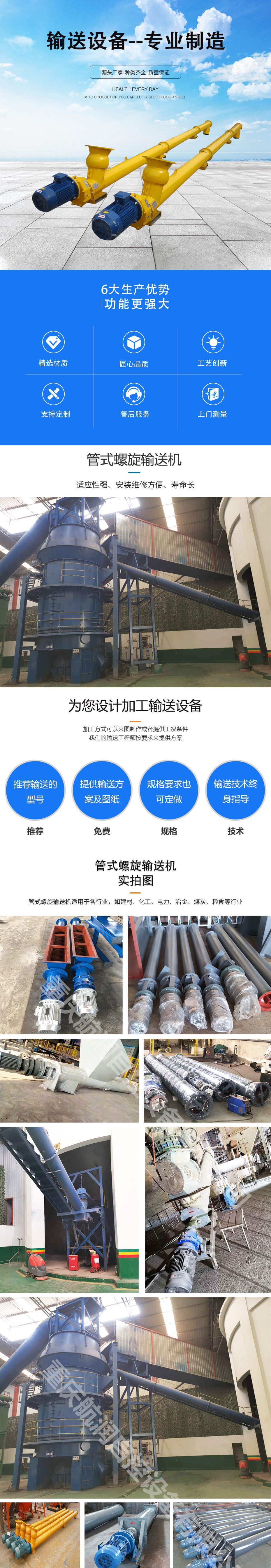 管式螺旋輸送機是礦產(chǎn)、飼料、糧油、建筑業(yè)中用途較廣的一種輸送機設(shè)備,對各種粉狀、顆粒狀和小塊狀等松散物料的水平輸送和垂直提升。如煤、灰、渣、水泥、糧食等。 承載能力大、適應(yīng)性強、安裝維修方便、整機體積小、密封性好、布置靈活;廣泛應(yīng)用于建材、化工、礦冶、電力、糧食等工業(yè)部門。