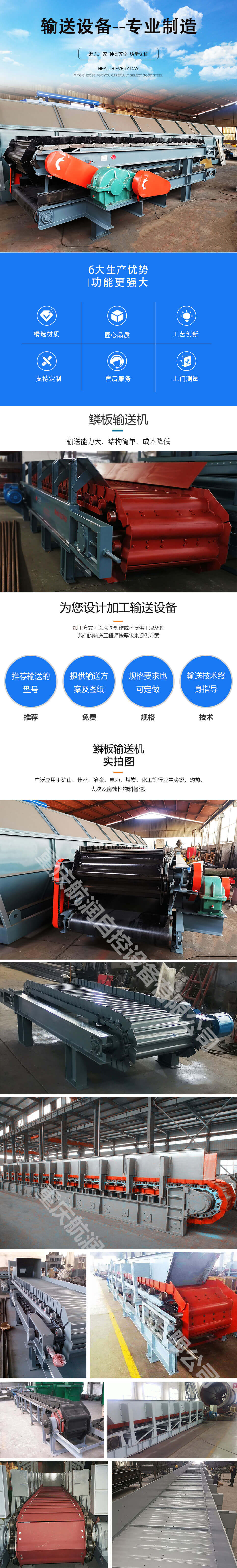 鱗板輸送機(jī)可以沿水平、傾斜方向輸送物料。不僅強(qiáng)度大、效率高、工作可靠,且輸送傾角可達(dá)30°~35°,輸送能力大、結(jié)構(gòu)簡單、成本降低、安裝維修方便、使用壽命長、工藝布置靈活多樣; 廣泛應(yīng)用于礦山、建材、冶金、電力、煤炭、化工等行業(yè)中尖銳、灼熱、大塊及腐蝕性物料輸送。